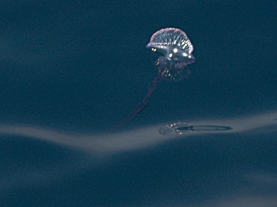 Ziemlich regelmäßig und in erstaunlich großen Mengen sieht man die Portugiesischen Galeeren, eine Quallenart mit eleganten halbkreisförmigen Segeln über das Wasser gleiten - so sieht es zumindest aus. In Wahrheit liegt der weitaus größere und unangenehmere Teil der Qualle unter Wasser: Lange dunkelblaue Tentakeln lassen einen schon von Ferne erkennen, dass man damit besser nicht in Berührung kommen sollte.