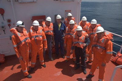 Noch am ersten Tag erhalten wir ganz vorbildlich eine Sicherheitseinweisung bis hin wie man das Freifall-Rettungsboot anwirft und ausklinkt. Ansonsten ist mit uns nicht viel anzufangen und wir verdösen den Tag (01.05.2012)