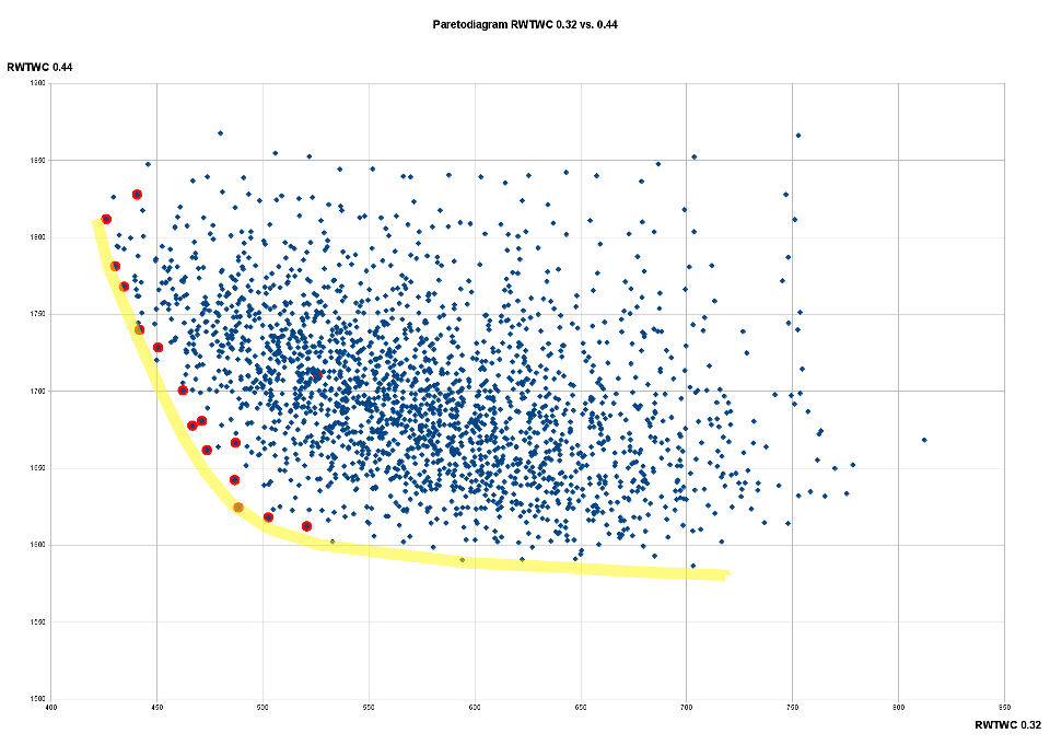 Aber jedes Schlechte hat auch sein Gutes: In den neuen Simulationen werde ich auf Grundlage der Ergebnisse einige Dinge verändern: Erstens werde ich nur die zwei Werte $F_n=0.32, 0.44$ berechnen. Das halbiert schon einmal die Rechenzeit. Außerdem werde ich die Parametergrenzen etwas ändern: Es fiel auf, dass alle guten Designs bei $BWL_{max}=1.8m$ und $BWL_{heck}=1.2m$ "klebten". Somit wird der Parameterbereich für auf $BWL_{max}=1.6...1.9m$ und $BWL_{heck}=1.1...1.4m$ geändert. Die Längslage der größten Breite bei $x=12m$ wurde ersatzlos gestrichen, weil der Wert keine sinnvollen Designs liefern konnte. Das wiederum führt dazu, dass es statt 3072 möglicher Designs nur 2304 geben kann. Auch davon werden sicher einige nicht gültig sein (die Modellparameterbestimmung läuft gerade), so dass ich bei wesentlich weniger als der halben Rechenzeit landen sollte, also vermutlich etwas 20 statt 42 Tage. Eigentlich hätte ich auch den Tiefgang von $T_c=1.1m$ streichen können, da dieser zusammen mit den gewählten Rumpfbreiten durchgängig zu kleine $BTR = {BWL_{max} \over T_c}$ (beam to draft ratio) Werte liefert (sollte etwa im Bereich 1.8...2.0 liegen).