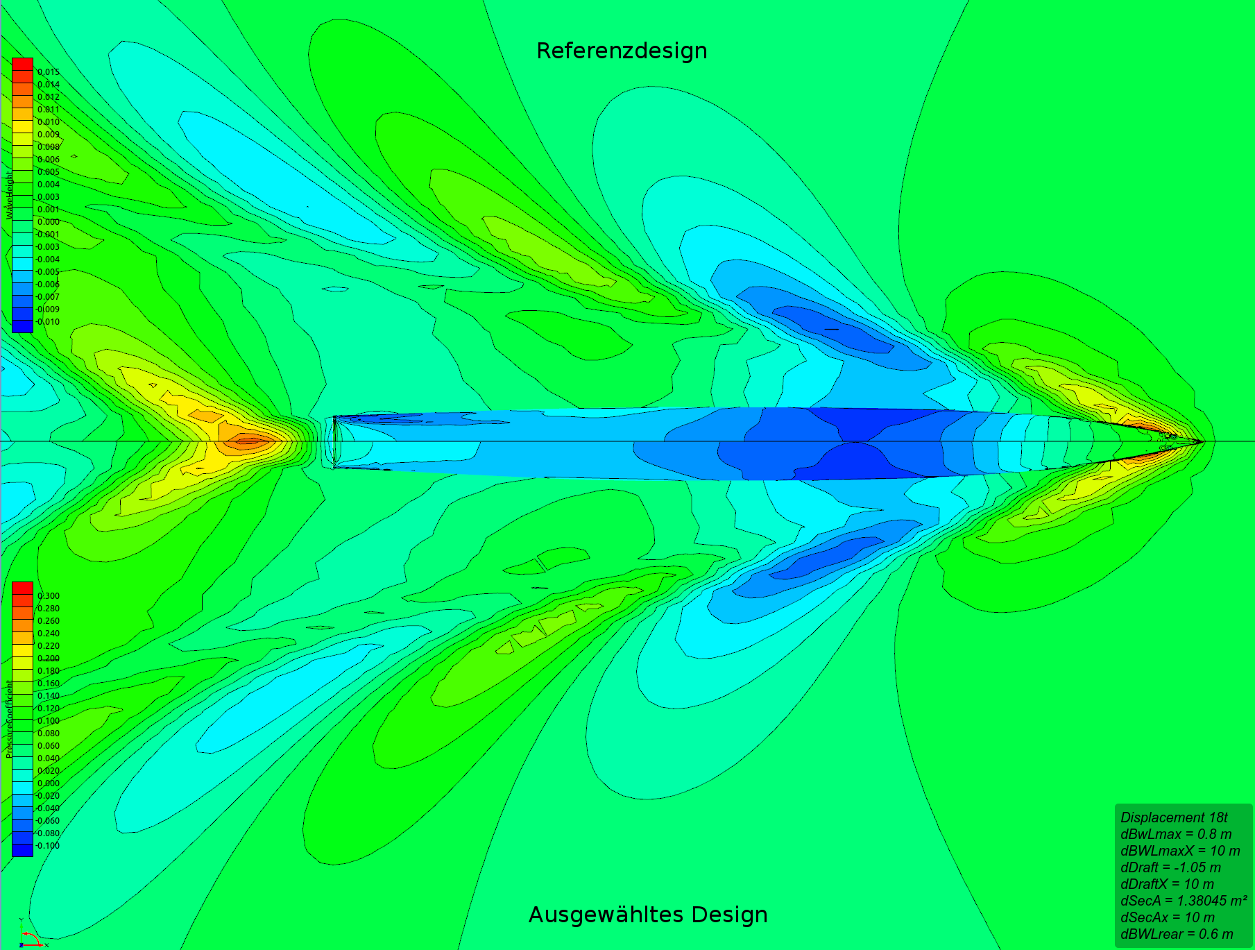 Beispielhaft ist hier ein Vergleich der Wellenbilder des Referenzdesigns zu einem der ausgewählten Designs abbgebildet (Abbildung 2). Es fällt auf, dass die Wellenhöhen des ausgewählten Designs etwas geringer sind. Auch die Druckverteilung am Rumpf zeigt weniger Unregelmäßigkeiten. Die Frage ist, ob letzteres nur auf eine zufällig bessere Diskretisierung zurückzuführen ist oder tatsächlich glattere Druckverteilungen widerspiegelt, was auf Lage und Geometrie der Knicke zurückgehen würde.