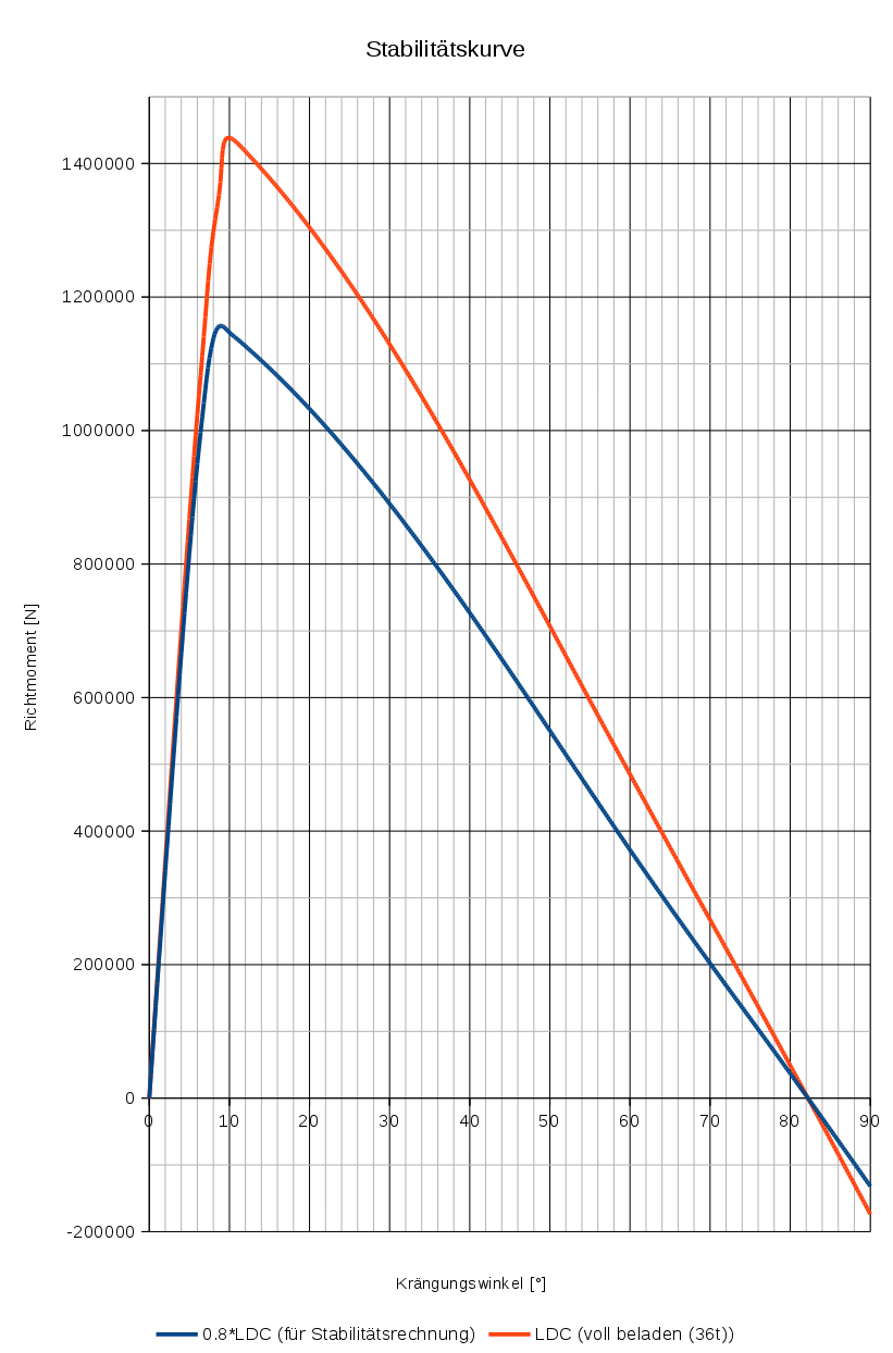 Berechnet wurden die Kurven für volle Beladung (LDC, 36t) und 80% der vollen Beladung. Der zweite Wert wird üblicherweise für die Auslegung der Segelfläche herangezogen. Bei der LDC-Kurve ist zu sehen, dass die kurz vor dem Maximalwert plötzlich nochmal steiler ansteigt. Das ist kein Rechenfehler, sondern Ausdruck der Geometrie: Der Rumpf weist 0,5 m über der Wasserlinie eine Verbreiterung von 15cm in Form eines relativ scharfen Absatzes auf (30° gegen die Waagerechte). Der ist für diesen Anstieg verantwortlich, da er bei ca. 10° Krängung ins Wasser eintaucht. Bei der 0,8*LDC Kurve fällt dieser Effekt derade auf das Maximum. so dass er nicht zu erkennen ist. Tabelle 1 zeigt die Kennwerte der Stabilitätskurven im Überblick.