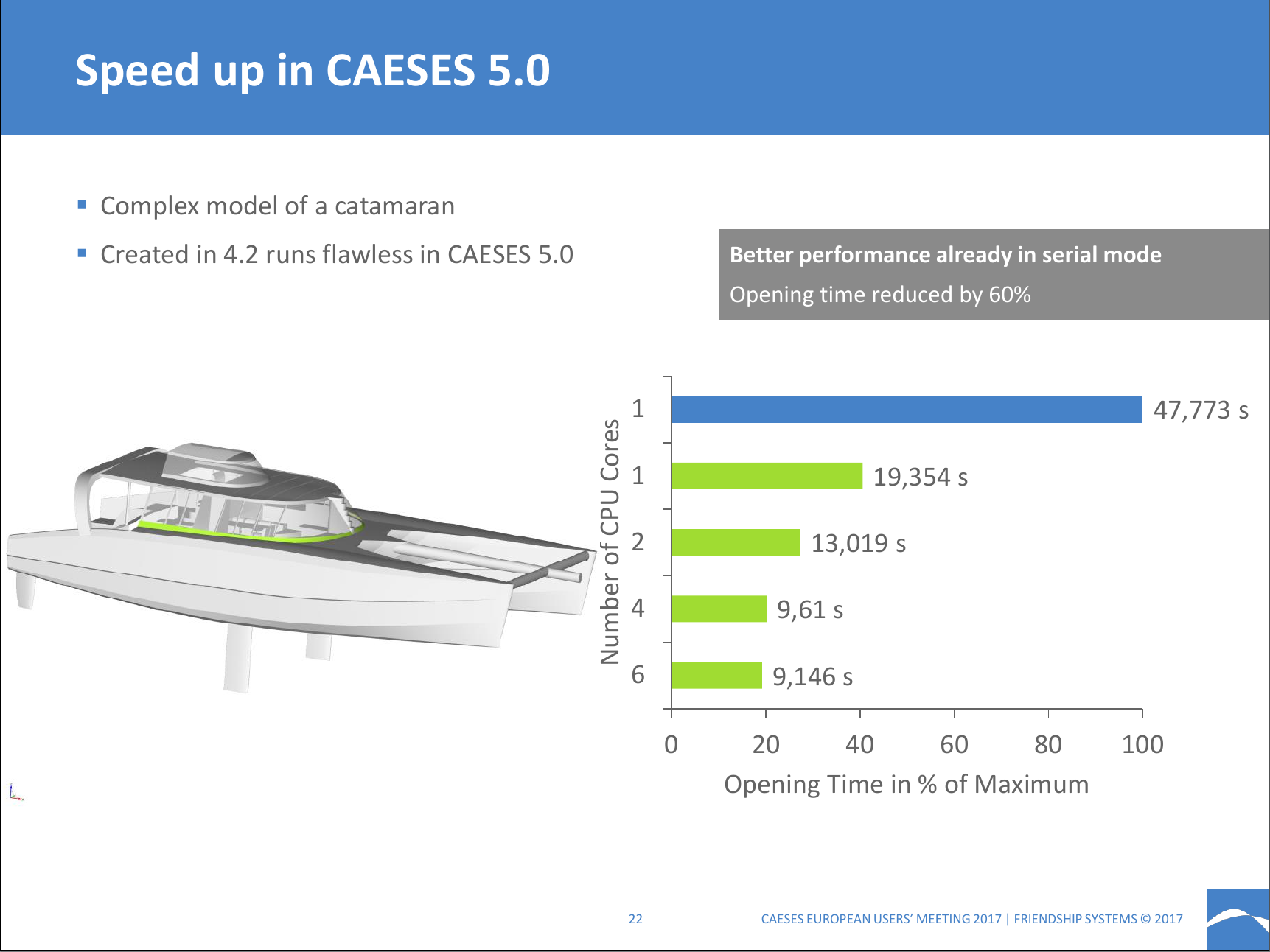 Und natürlich fiebere ich der CAESES Version 5.0 entgegen, die in der Lage sein wird, mehrere Prozessorcores zu benutzen. Das stellt gerade für mein umfangreiches Modell einen großen Gewinn dar. Wegen der Komplexität meines Modells hat Friendship Systems mein Modell als ein Beispiel für den Geschwindigkeitszuwachs beim Öffnen herangezogen. In Version 5.0 wird mein Modell mehr als 4x so schnell geladen, wie aus Abbildung 2 zu ersehen ist. Die Folie war Teil des Vortrags von Stefan Harries, einem der Gründer von Friendship Systems, der mir freundlicherweise erlaubt hat, seine Folie auf meiner Webseite zu veröffentlichen.