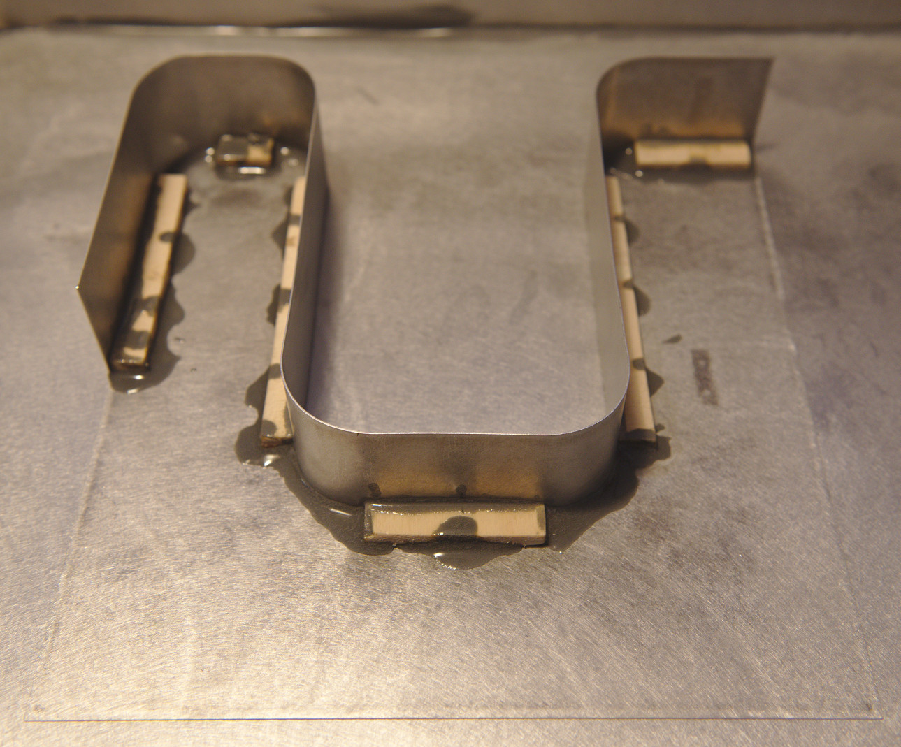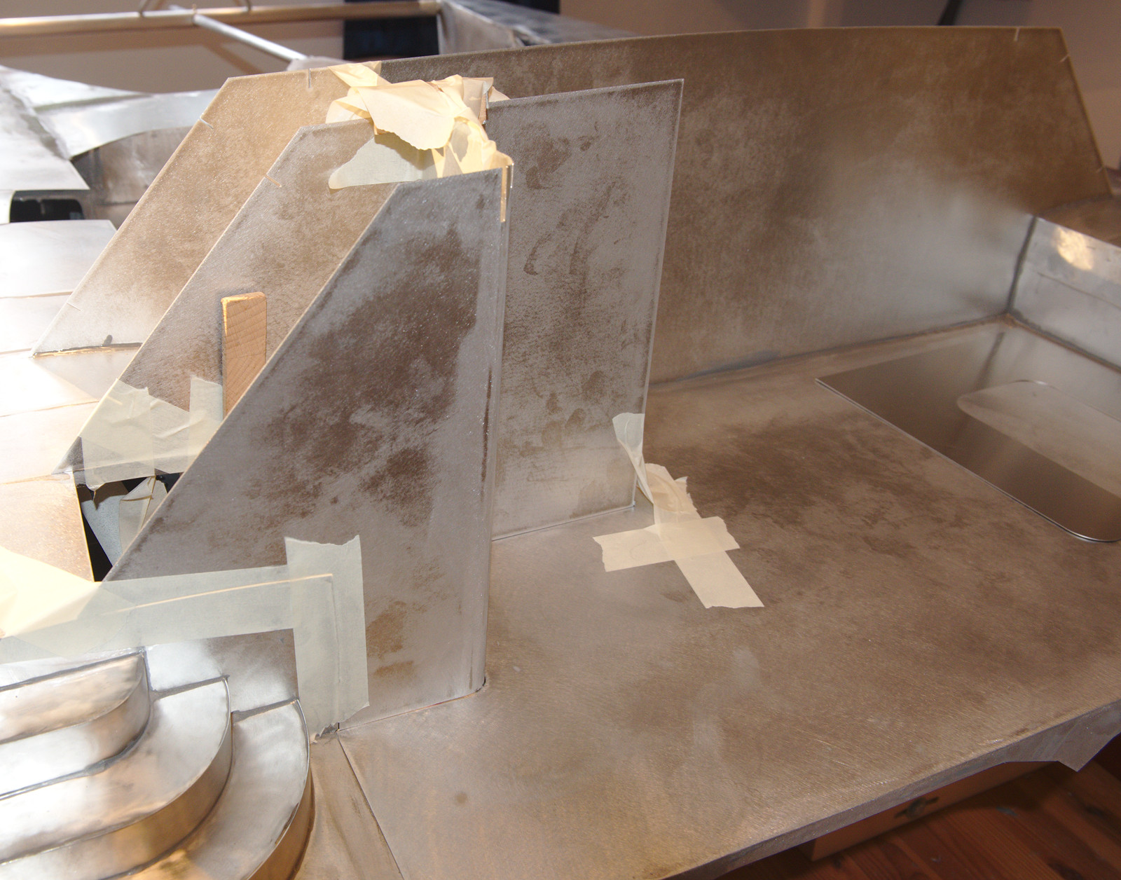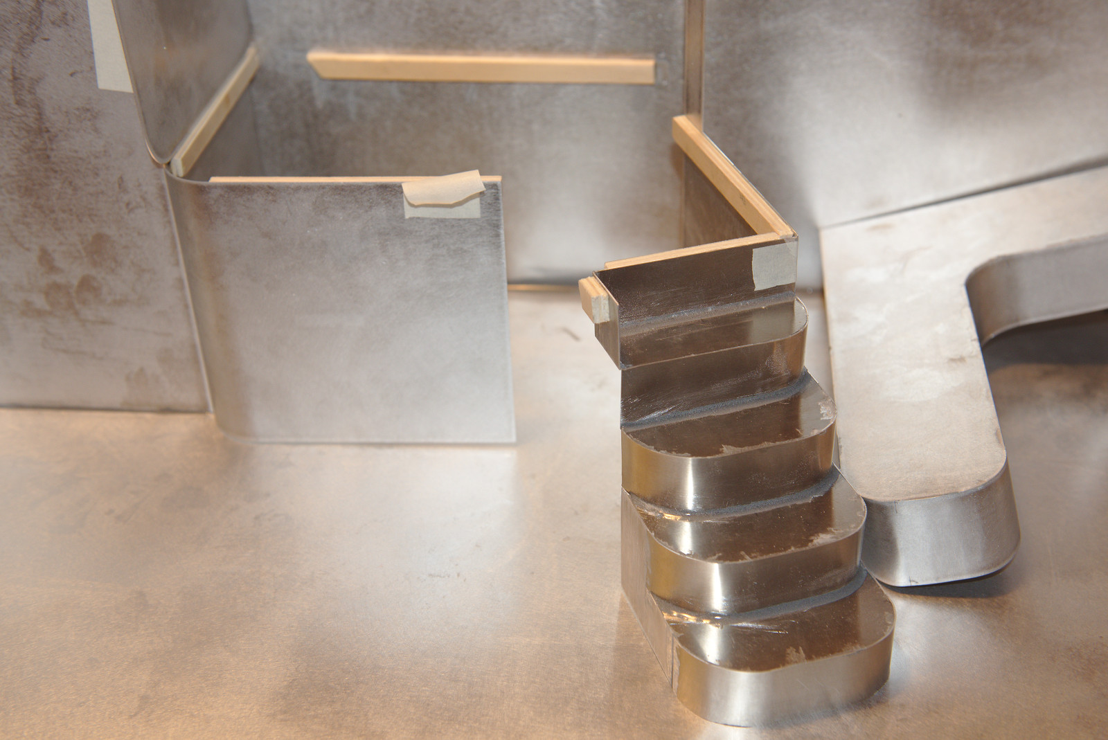 Als nächstes waren viele Biegearbeiten für die Außeneinrichtung nötig, die das Modell detailgetreu nachbildet: Der Steuerstand, die Treppe zum Steuerstande und besonders bei dem senkrechten Blech für die Außensitzgelegenheit mussten die Rundungen an exakt der richtigen Stelle liegen, wo nur genaues nachmessen am Computer, richtiges Anzeichnen und vorsichtiges Biegen um HT-Rohrverschlusskappen hilft (Abb. 2-4).
