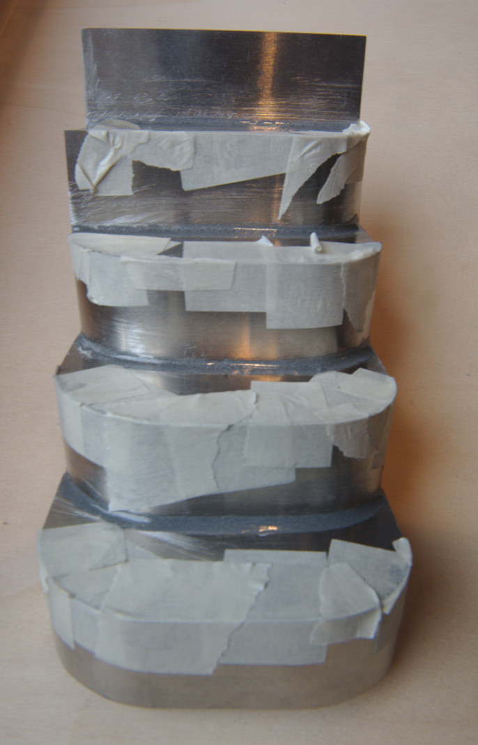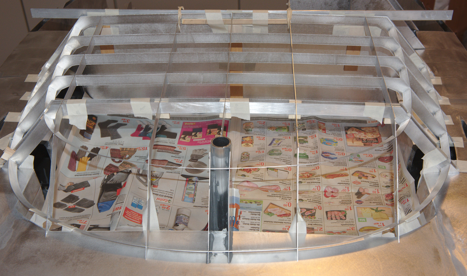 Ein weiter wichtiger Stützpunkt für die Ausrichtung des Deckhauses ist die Maststütze, die im Modell überpropotional massiv ausfällt, da dies das einzige 30mm Alurohr war, das ich im Baumarkt ergattern konnte (ich hatte natürlich vergessen, es beim meinem Alulieferanten, der das Mastprofil geliefert hat, mitzubestellen...). Der große Spant wird an der Oberkante mit einem 3mm Aluprofil und Klebeband versteift und exakt gerade ausgerichtet. Die 3mm Dicke entsprechen dem Abstand zu den Enden der Längsspanten des annehmbaren Teils des Deckhauses zum großen Spant, so dass die Längsspanten auch dort exakt ausgerichtet werden können. Der Rest folgt meinem bewährten Stecksystem, das automatisch für die richtigen Abstände und Ausrichtungen sorgt. Die Hölzchen im vorderen Bereich dienen nicht der Abstandhaltung, sondern dazu, die beweglichen Teile der Längsspanten seitlich an den fixen Teilen auszurichten, so dass sie fluchten. Dazu haben die Klötzchen 0,8mm breite Einschnitte, in denen die Längsspanten eingeklemmt werden. Eine genaue Ausrichtung ist wichtig, weil sonst Dach und Seitenteile nicht gut passen würden (Abb. 5).