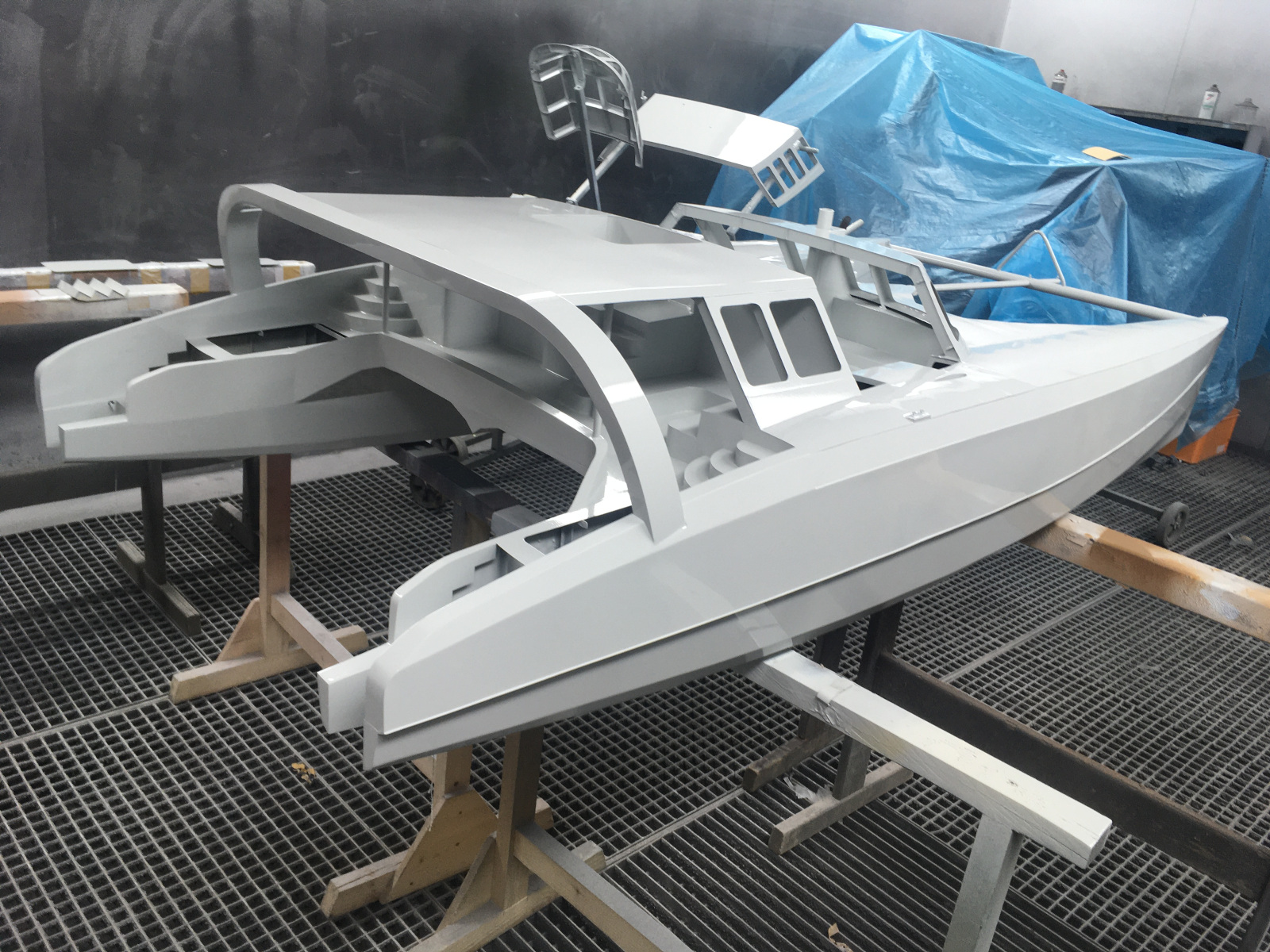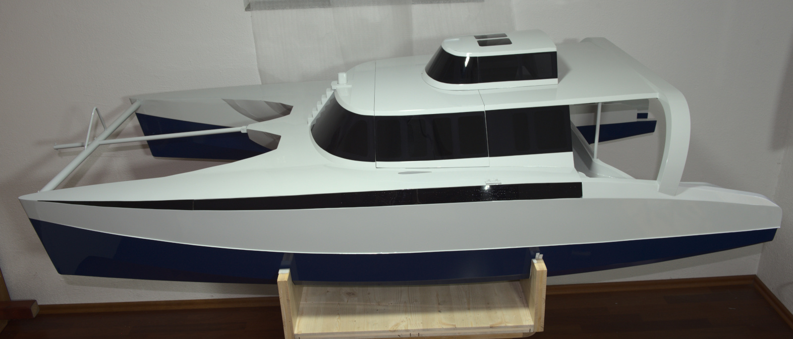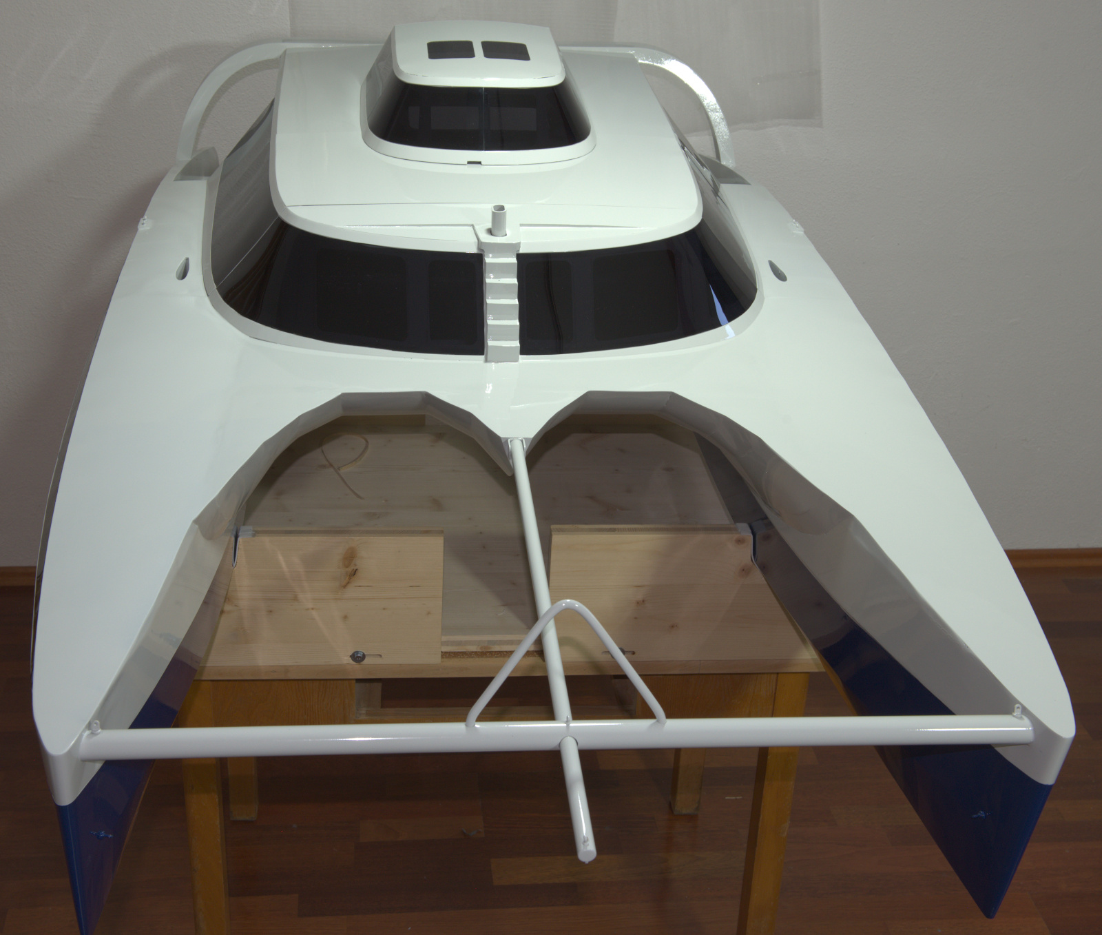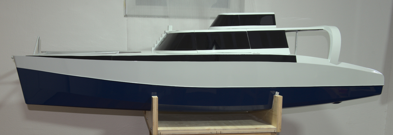 Nach so viel Arbeit mit dem Bau des Modells, musste natürlich eine professionelle Lackierung her, da das mit einer Sprühdose nicht zu schaffen ist. Die Farbwahl fiel auf Lichtgrau (RAL 5035) für alle oberen Bereiche und Saphirblau (RAL 5003) für alle Bereiche unterhalb des Verbreiterungsknicks. Lichtgrau ist sicher auch eine gute Wahl für das Original, da es bei heller Sonne nicht so extrem in die Augen blendet wie ein Reinweiß und nicht so schnell zum vergilben neigt. Das Saphirblau passt sehr gut zum maritimen Flair. Wenn es eine Volllackierung am Original geben wird, dann sicher in denselben Farben.