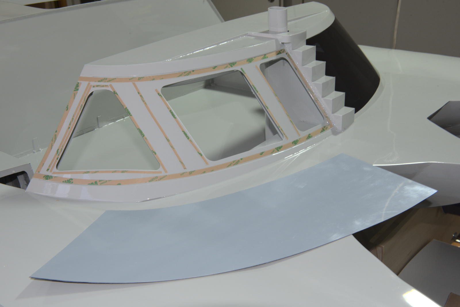 Den finalen Touch geben die dunkelgrauen Plexiglasscheiben in 0,5mm Dicke, die ich mit einem speziellen Acrylatklebeband aufgeklebt habe, da dies verhindert, dass der Kunststoff vom Kleber angegriffen und dadurch trübe wird oder der Kleber Laufspuren hinterlassen kann. Für alle Scheiben habe ich zunächst Schablonen aus dicker Pappe angefertigt und die abgewickelten Konturen auf die Plexiglasscheiben übertragen. Da das Plexiglas beidseitig durch eine Schutzfolie geschützt wird, kann man es einfach mit einer scharfen Schere (für die Rundungen) oder mit dem Teppichmesser und (Metall-)Lineal schneiden.