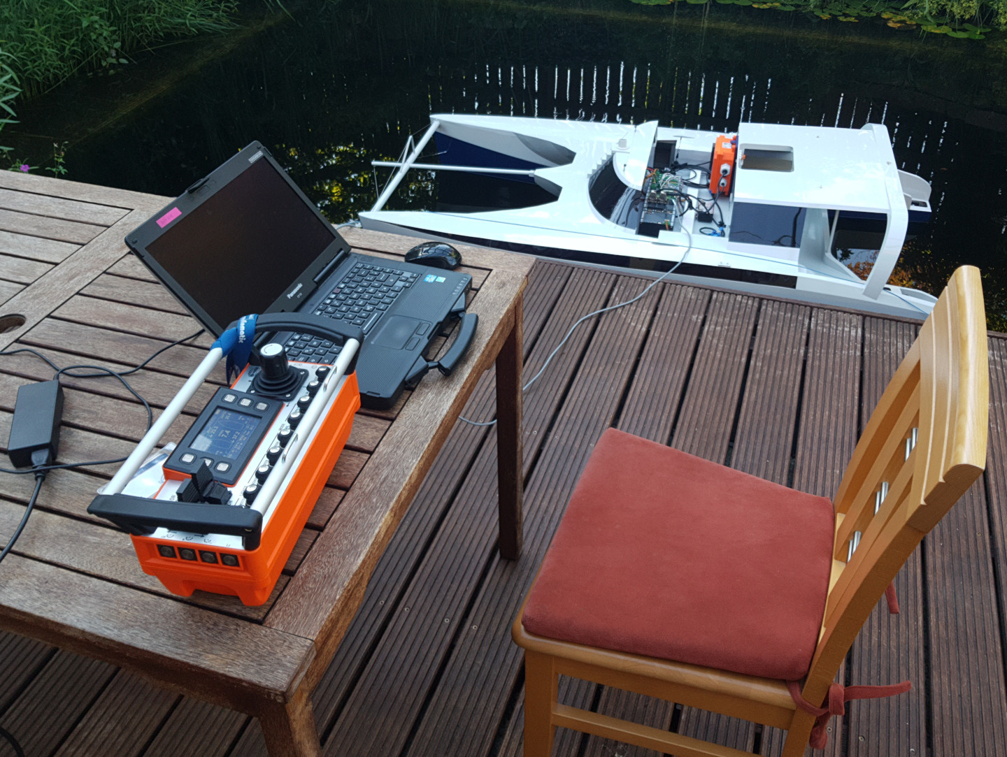 Nun stand den Testfahrten nichts mehr im Weg. Im ersten Video wird der Joystick auf eine seitliche Position eingestellt. Der Katamaran bewegt sich seitwärts, aber er verdreht auch ein wenig. So ein Mist könnte man jetzt sagen, das funktioniert ja gar nicht. Das ist aber leider falsch: Die Open Loop Steuerung funktioniert genau wie sie soll: Sie ist nicht in der Lage die durch den Wasserwiderstand induzierte Drehung auszuregeln, da sie schlicht nicht modelliert ist. Deshalb wird es einen zweiten Test im Closed Loop Betrieb geben, bei dem die Drehbewegung stark reduziert sein sollte.
